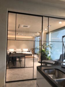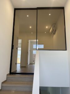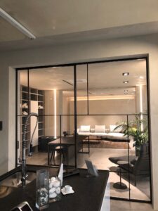 il vetro è perfettamente trasparente per una continuità dell’ambiente che va a dividere. Oppure stinato per schermare la vista.